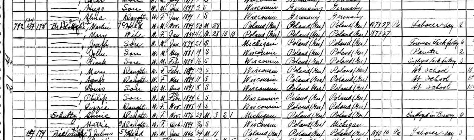 In 1880, the family appears on the US Census living in northeast lower Michigan in Presque Isle County, near the shore of Lake Huron. They were renting a farm in the little Polish farming community of Krakow, just outside present-day Rogers City. The Brodowski family's tenure in Krakow was brief, as Joseph had been born in Manistee less than a year before and the family had moved to Milwaukee by May 14, 1881 when son John was born. The Brodowski family moved to Milwaukee in the same year that Mary Brodowski's mother, brothers and sisters immigrated to Milwaukee. Mary's mother Francisca and siblings Michal, Anton, Joseph and Francisca all emigrated from the Swiatkowo area to Milwaukee in 1881, likely prompting the Brodowski family to move from Michigan to Milwaukee. The family settled in Milwaukee's Polish south side in a house at 860 20th Avenue (now S. 25th St). Martin worked as a day laborer while Mary was a homemaker. The Brodowski family continued to grow with son Frank arriving on February 29, 1884 daughter Mary on February 2, 1887, daughter Agnes on March 12, 1889, son Louis on August 28, 1891, son Theofil (Phillip) on February 11, 1894 and daughter Elizabeth in November 1895. Milwaukee had many parochial schools and the Brodowski children were all instructed in both Polish and English. The family attended St. Hyacinth Parish on Becher Street where their children also attended school.