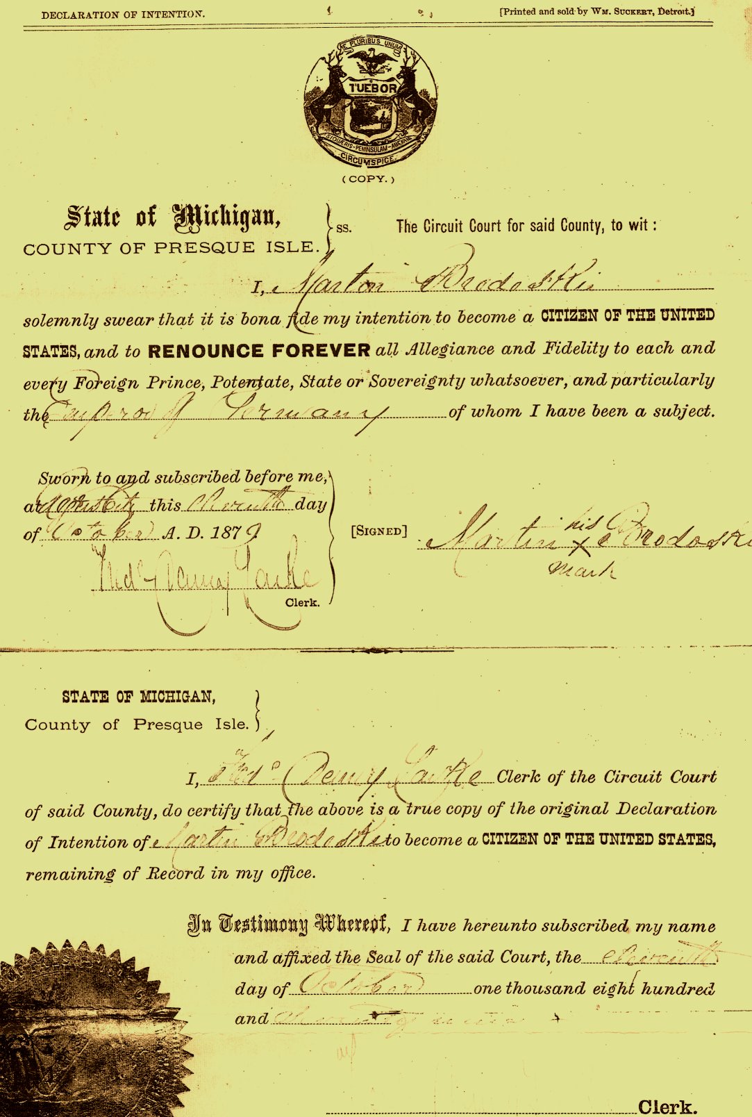 ![]() Martin Brodowski Declaration of Intent signed at Rogers City, Presque Isle County, Michigan October 11, 1879 |