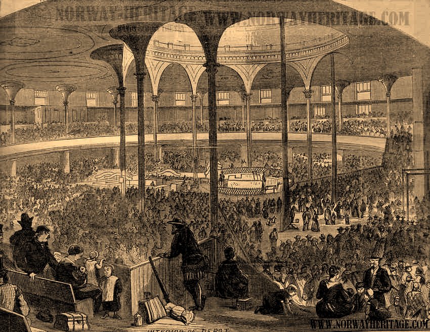 ![]() Castle Garden Interior 1870 from an original woodcut Courtesy of NorwayHeritage.com |