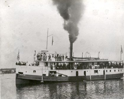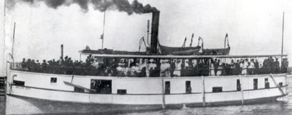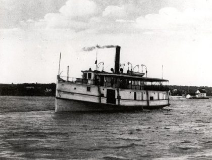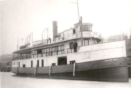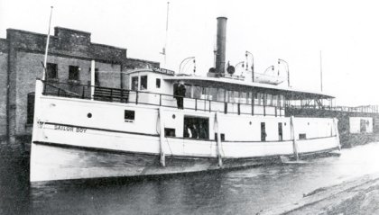Newspapers throughout the UP carried the story of the burning of the popular excursion steamer Sailor Boy at Hancock on May 12, 1923. She was used to ferry passengers to points around the Keweenaw Peninsula for many years before her loss and was a well known vessel. The fire which claimed her started from unknown origins and quickly engulfed her while she was docked at Hancock. Her mooring lines burned through and she drifted about until she beached just off Osceola Point near the old Stringer Sawmill Dock. She came to rest about 100 yards east of the point and 30 ft. from shore where she gradually sank beneath the water.