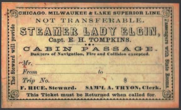 Lady Elgin Ticket 1858 - Courtesy of the Great Lakes Shipwreck Research Foundation,