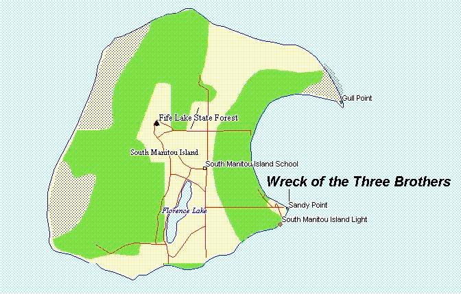 Over the next 50 years, a sand bar formed around the Three Brothers and eventaully enveloped her. She was covered so completely that wreck hunters who looked for her in the 70s and 80s found no sign of her. Then, in the winter of 95'/96', Lake Michigan decided to uncover her. When David Nagel and David Wilkins of the Sleeping Bear Dunes National Lakeshore returned to opn the park on April 30th, 1996, they discovered the Three Brothers lying under water where Sandy Point had previously been. Today, she can be seen from the surface and is usually buoyed. Her LON/LAT is 45.00'62" / 86.05'49".